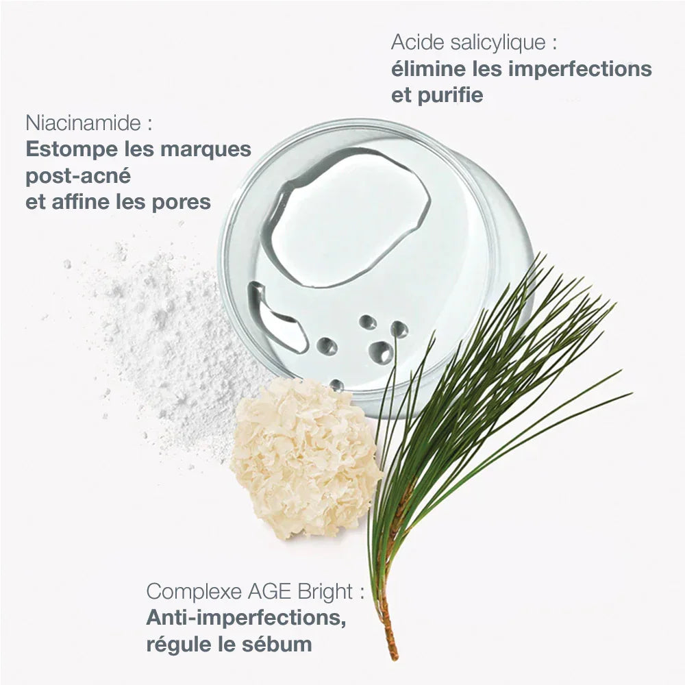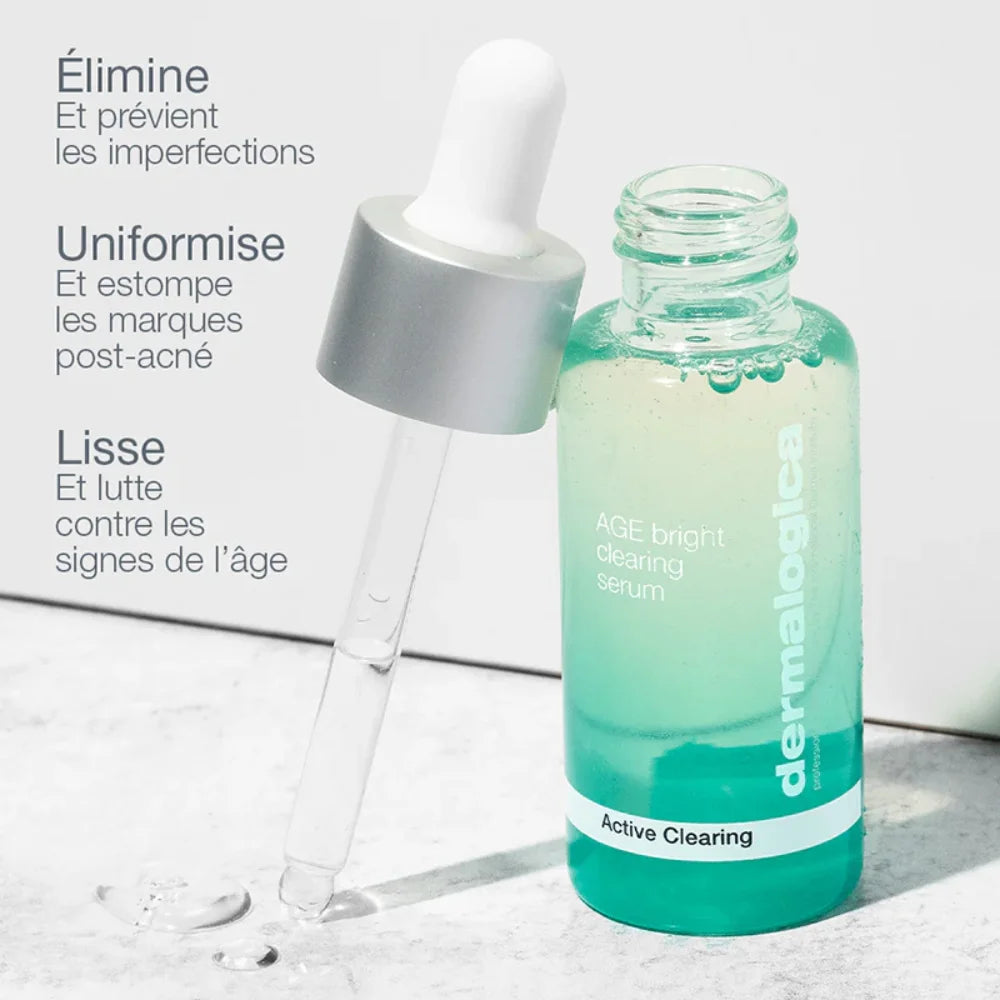 AGE Bright Clearing Sérum contient le complexe AGE Bright qui travaille en symbiose avec le microbiome naturel de la peau pour éliminer les imperfections.